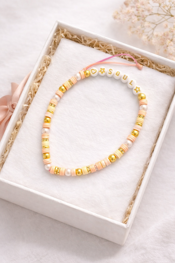 Dieser liebevoll handgefertigte Handy-Anhänger mit der Aufschrift „SOUL“ ist ein zartes Accessoire mit Bedeutung. Sanfte Rosé- und Cremetöne, schimmernde Perlen sowie goldfarbene Akzente verleihen dem Anhänger eine elegante und zugleich verspielte Ausstrahlung.