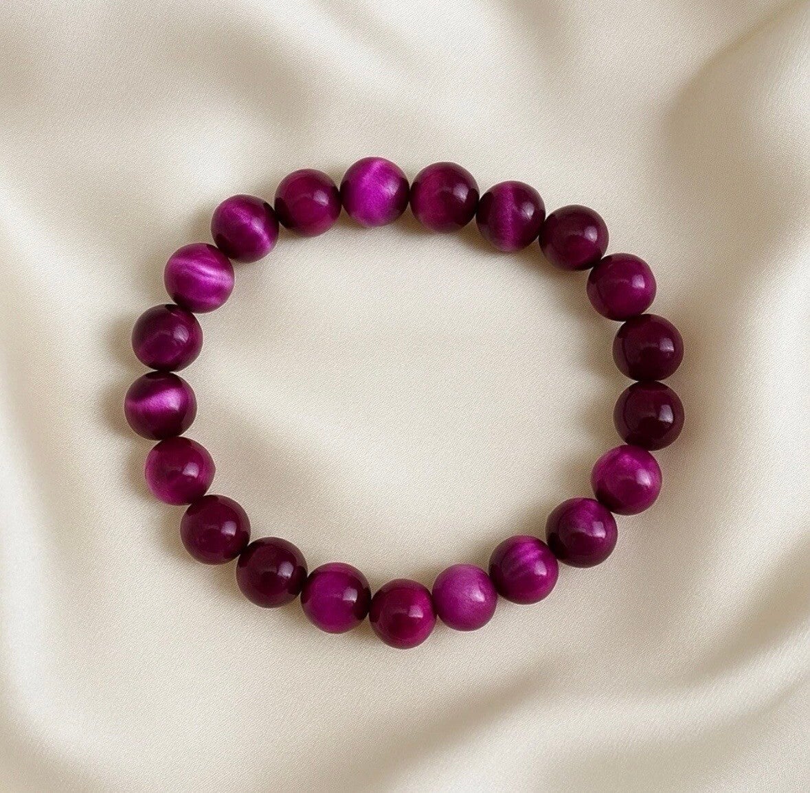 Dieses handgefertigte Tigerauge-Armband begeistert durch seine intensive violette Farbgebung und den typischen, sanft schimmernden Glanz des Natursteins. Tigerauge steht traditionell für Stärke, Schutz und innere Balance – kombiniert mit der eleganten Farbe wirkt das Armband kraftvoll und zugleich modern.