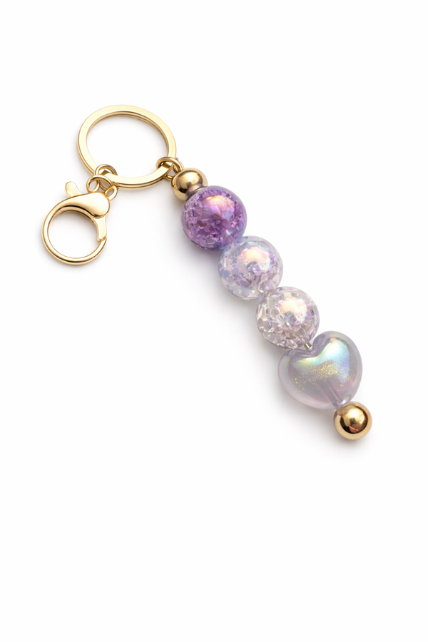 Die Kombination aus lila Crackle-Perlen und einem schimmernden Herz-Anhänger wirkt elegant, verspielt und gleichzeitig romantisch. Durch die goldfarbenen Details passt er perfekt zu Taschen, Schlüsseln oder als süßes Accessoire am Rucksack.